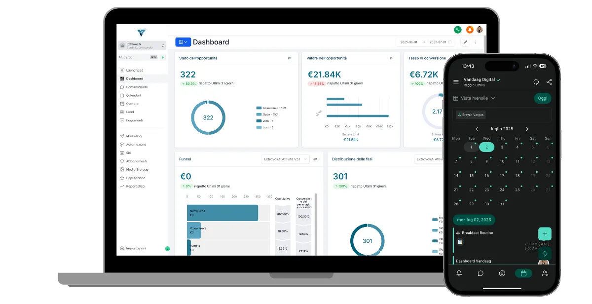 Insieme al nostro team, analizziamo la tua attività, i risultati attuali e gli obiettivi per configurare la tua strategia completa con Vandaag CRM, il nostro software di marketing.